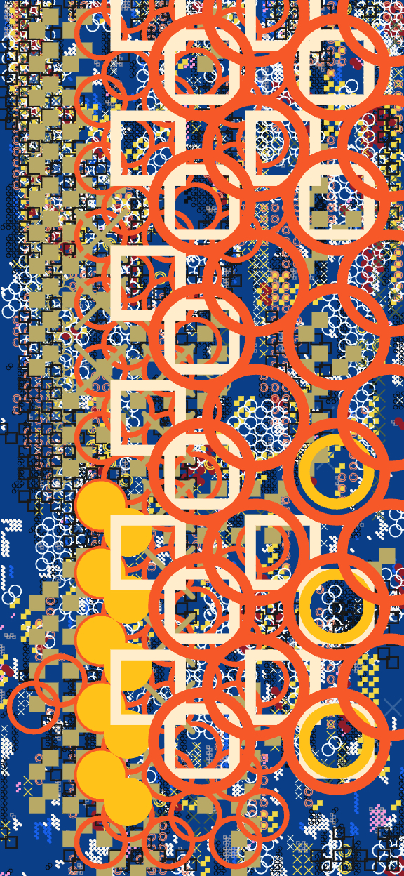 さまざまな天気が記号に変換され、層(strata)となって都市に混ざり込む。微細な記号群は窓ガラスに残る雨粒を思わせ、鮮やかな色はガラスの向こうの車列や看板の光の反射を思わせる。気象の移ろいと都市の光が、同じ画面の中で同居する。