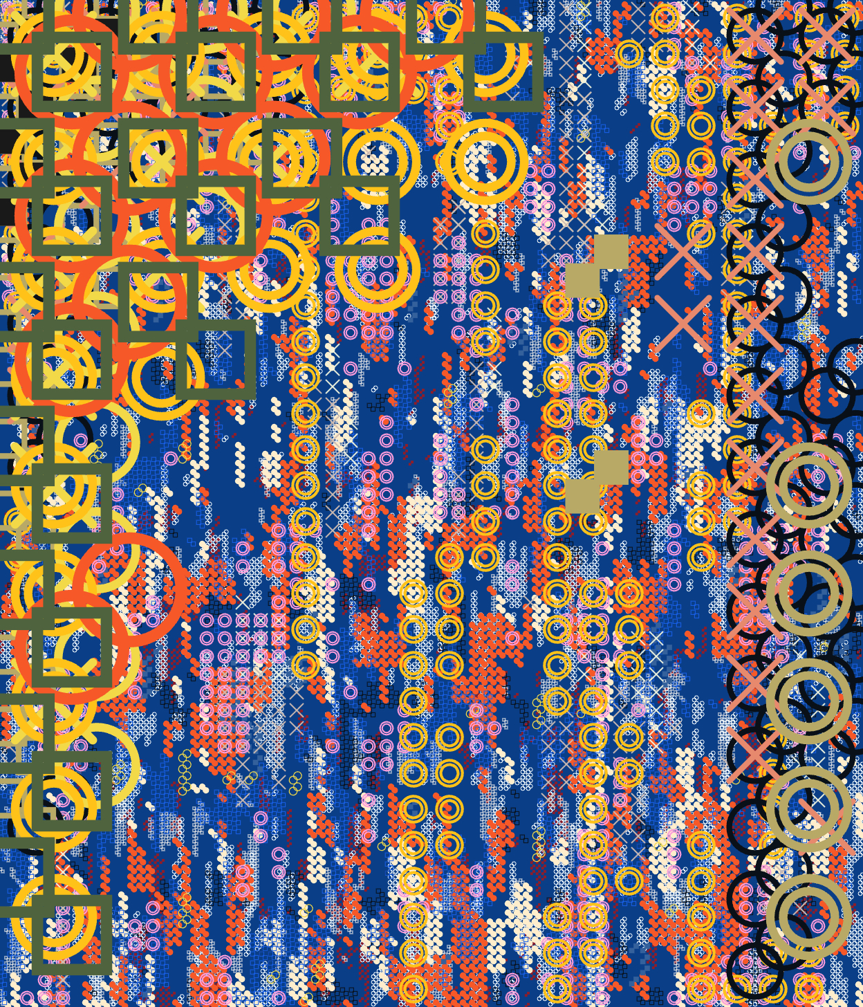 さまざまな天気が記号に変換され、層(strata)となって都市に混ざり込む。微細な記号群は窓ガラスに残る雨粒を思わせ、鮮やかな色はガラスの向こうの車列や看板の光の反射を思わせる。気象の移ろいと都市の光が、同じ画面の中で同居する。